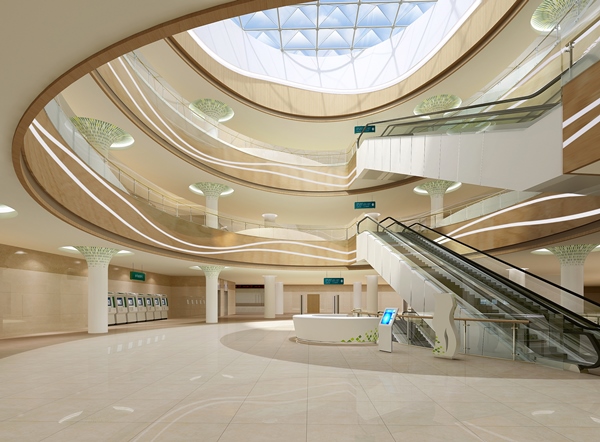对国酒茅台医院,室内设计力求做到与建筑风格上的连贯和统一性,同时结合茅台酒文化、企业文化,通过现代的装饰手法,对文化进行提炼,让空间的柱体蕴含着大树的思想,托起整个中庭,而柱身上参数化设计的叶片也更加自然清新。整体营造出自然,温馨及健康的氛围。