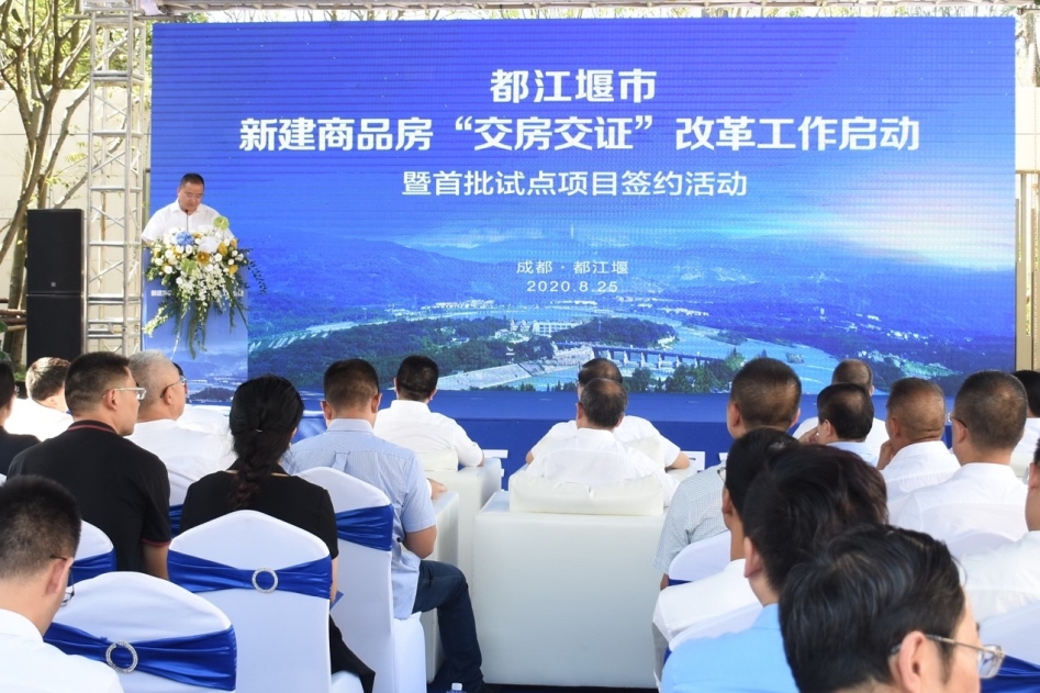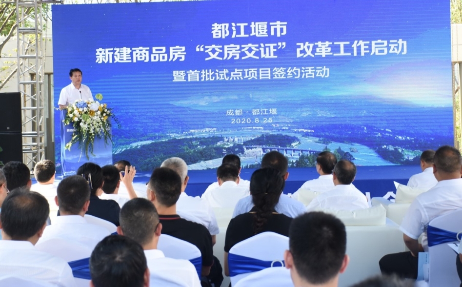 胡斌、张亚丹分别致辞,对都江堰市“交房交证”改革工作启动暨首批试点项目签约活动顺利举行表示了祝贺,并对都江堰市各相关部门的“交房交证”改革筹备工作提出了要求,希望以此活动为起点,早日实现购房群众的住权与产权同步化。